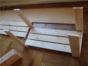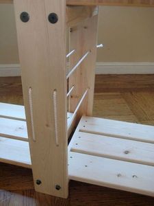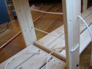 Узлы должны располагаться на задней стенке скамейки. Когда узел затянут, веревка отрезается и шнуровка продолжается на двух других брусках. По краям скамейки перегородка ограничивается одной линией. Другие перегородки представляют собой две параллельные веревки и две «вертикальных» линии.