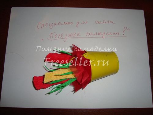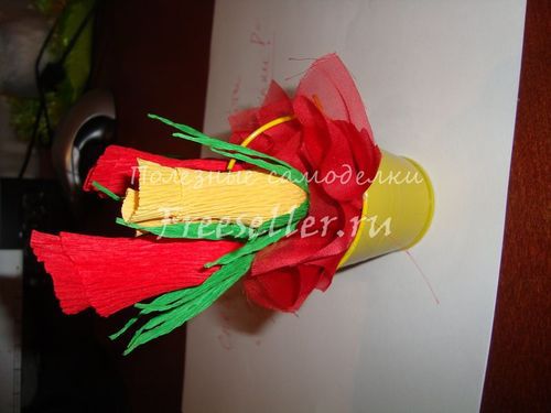 На первом этапе вырежьте из бумаги красного и желтого цвета вытянутые овалы по три на каждый цветок. Приклейте конфету к шпажке и вокруг обмотайте листья будущей розы, Из зеленой бумаги вырежьте полоску с частыми зубчиками- это будет зеленая часть стебля и оберните ее вокруг бутона.
