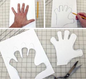 Для начала на бумаге нужно обвести контуры руки и вырезать. Это будет заготовка для рук синего монстра. Пальцы лучше растопырить как можно шире.