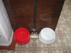 Ручку рогов отрезал ножовкой и припаял на крестовину пол дюйма на 0,25 с помощью паяльника для пластика. После осталось одеть термоусадку на трубу, которая выступила позже как шток, по которому катаются рама с тарелками, и поднес к огню. В конце всего действа вставил раму на шток и припаял последнюю крестовину, и мне только осталось прикрепить её к столу. Что я и сделал и дал опробовать собачке, получилось легко, дешево и достаточно прочно. Тарелка легко снимается и так же ставится, песик рад и мы не переживаем за его молодой хребетик, который должен развиваться.