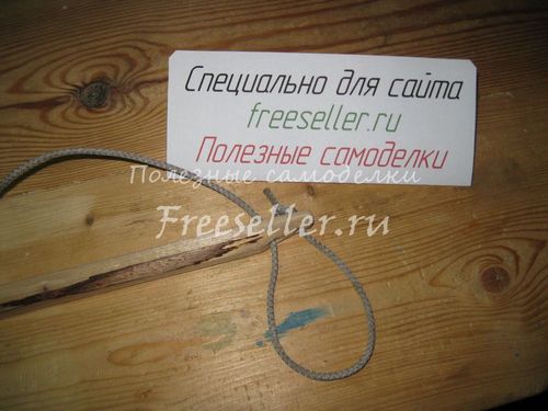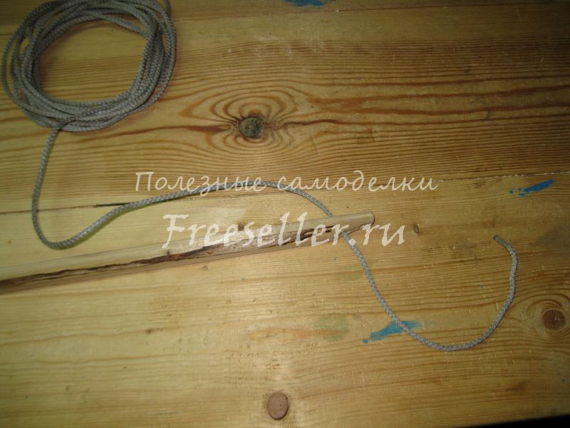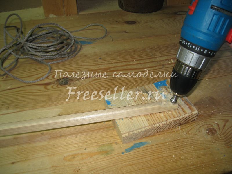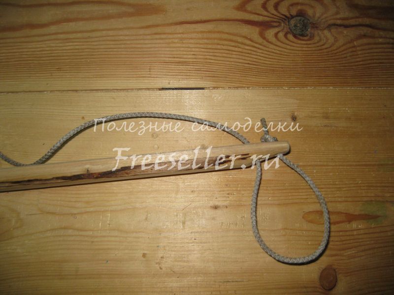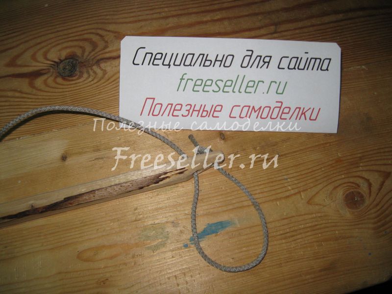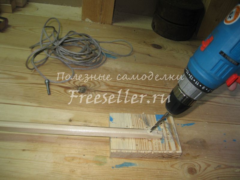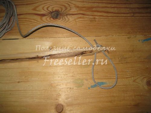 Затем продеваем веревку в нижнее отверстие на конце бруска.