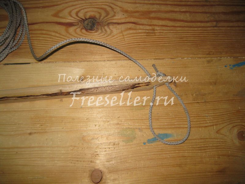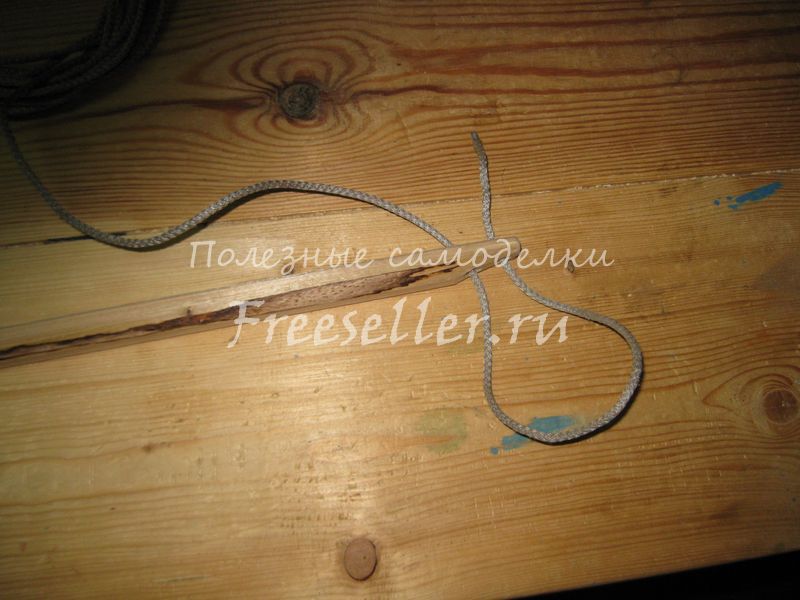 Кончик веревки завязываем узлом для того, чтобы он не выскочил из отверстия.