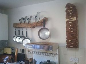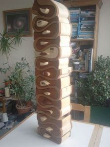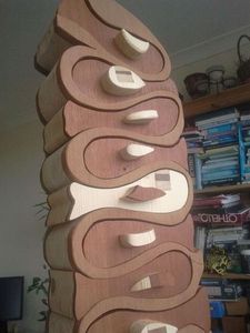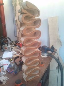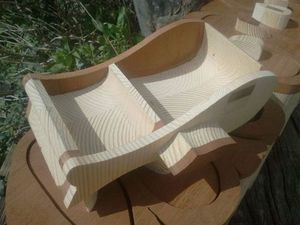 Комод довольно высок и имеет необычную форму полочек, напоминающую рыбку. Вся работа по изготовлению формы выполнена с помощью ленточной пилы.