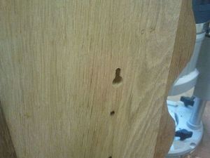Как уже не раз отмечалось, комод получается достаточно высоким, поэтому, во избежание несчастных случаев, его лучше всего закрепить на стене. Для этого на задней стенке вырезаются отверстия, напоминающие по форме замочную скважину. В них будут вставлены шляпки гвоздей или саморезов.