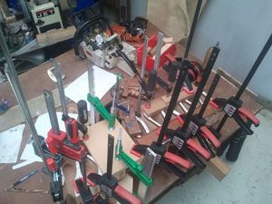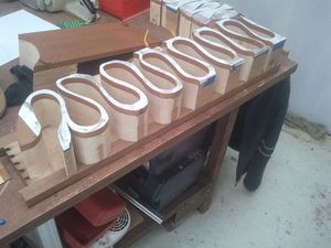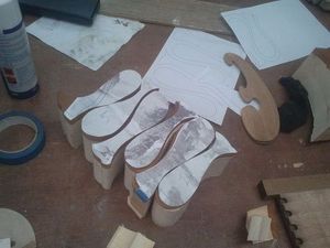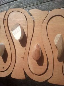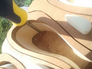 Между ящиками-рыбками оставлены перегородки. Шаблон - форму можно нарисовать на кальке или распечатать на принтере, после чего перенести на древесину. Если вы будете использовать идею целиком и изготавливать комод из клееной древесины, то обратите внимание на клей: столярный спрей будет сохнуть быстрее и оставляет меньше следов. В противном случае, потребуется обеспечить максимально возможное прижатие слоев друг к другу.