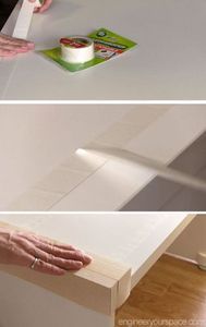 Оклейте столешницу малярным скотчем, чтобы наметить расположение досок. После чего, постепенно отклеивая скотч, наносите столярный клей и приклеивайте доски.