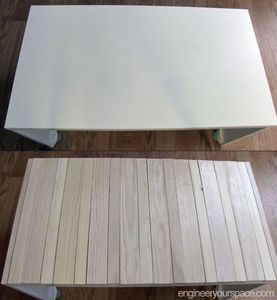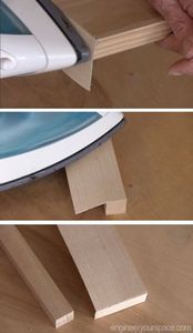 Чтобы создать иллюзию более толстых досок, по краю стола приклеиваем с помощью горячего утюга кромочную ленту.