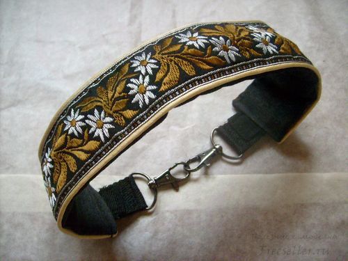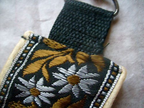 Ручка отстёгивается, когда сумка носится на ремне через плечо. Для изготовления ручки нам понадобились стропа, толстый шнур, два карабина, широкая тесьма с орнаментом, утолщённый по одному краю кант, прочная ткань (например, джинс), швейные принадлежности.