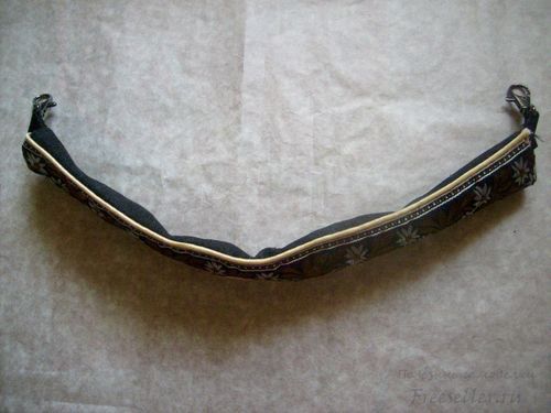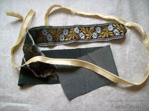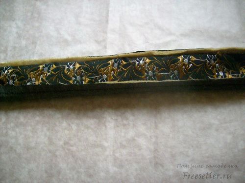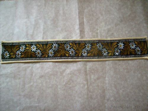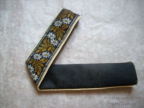 Из плотной ткани выкраиваем полоску длиной с тесьму и немного шире. Сшиваем их, сложив лицевыми сторонами вовнутрь.