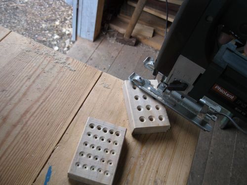 Далее отпиливаем подставки электролобзиком, а для того, чтобы их удобнее было вставлять в картонные пакеты, отпиливаем у них уголки.