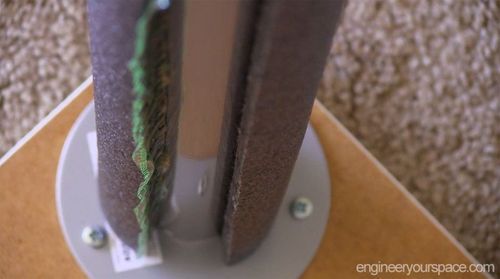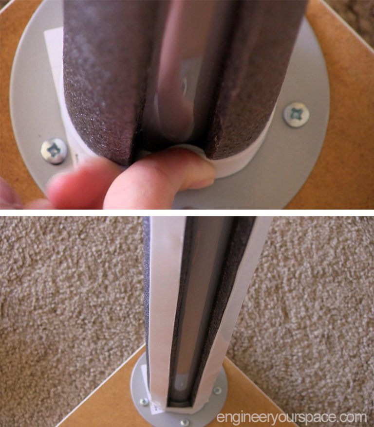 Отрежьте 4 куска изоляционной трубы равные длине ножки стола. Затем оберните их вокруг ног. Разрыв изоляционной трубы поверните внутрь стола для того, чтобы он был менее незаметен. Когтеточка в итоге получится примерно такая же по диаметру, как и продаются в магазинах.