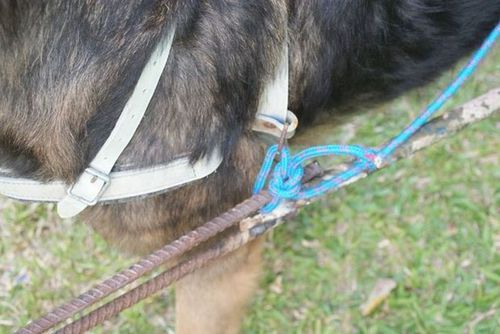 Последним этапом является пристегивание собаки к тележке. Для этого необходим собачий поводок, который идет через все тело. Поводок надевается на собаку, а затем концы веревки продеваются в отверстия в зубьях.