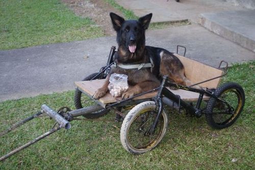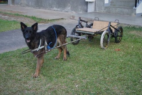 Современный способ использования сломанных велосипедов! >Множество пород собак имеют сильную спину и мощные мышцы задних ног. Такие собаки способны вести на тележке тяжелый груз. Телегу можно сделать самому из старых велосипедов.