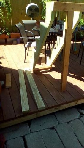На первой фотографии видно, что для поддержки конструкции сначала используется запасной брус всотой 115 см. Затем прикрепляются основные стойки. Фиксируются они под поперечным бруском с помощью болтов.