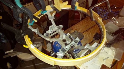 Чтобы избежать повреждения наружного обода, внутрь можно вставить дополнительное кольцо, к которому и будут крепиться держатели. Чтобы закрыть следы работы, используют смесь опилок, воды и винилового клея. Закрепите кольца с помощью держателей.