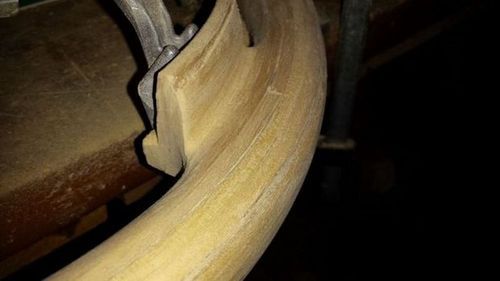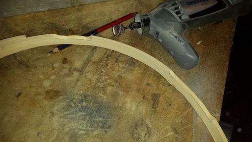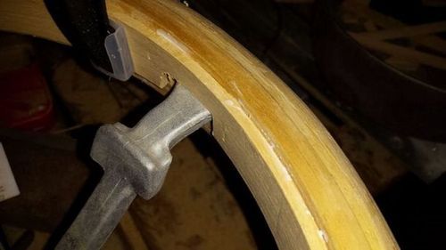 С внутренней стороны в местах, где будут крепиться спицы, нужно приклеить кусочки деревянных планок небольшого размера. Поскольку внутренняя часть руля изогнута, необходимо применить некоторое давление. Можно поступить проще и использовать изогнутые куски планки.