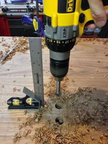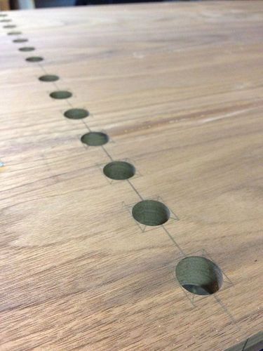 Для того, чтобы разделить большую коробку стола на две половины, в центре столешницы просверлите отверстия, а после растачайте их до квадратов. В таком случае пазы, сделанные на перегородке, войдут в крышку идеально.