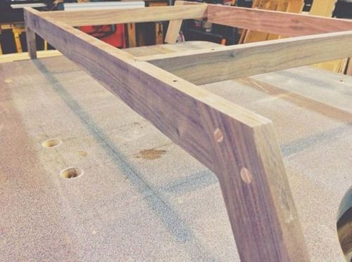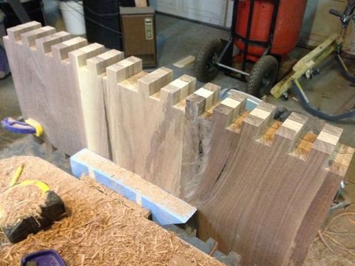 Ножки склеиваются из нескольких досок и после высыхания обрезаются под углом 200С. Высота их определяется вами индивидуально. Крепиться ножки будут так же на врезные пазы к корпусу и деревянные шипы.