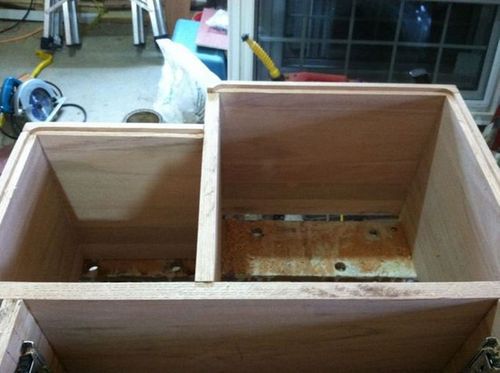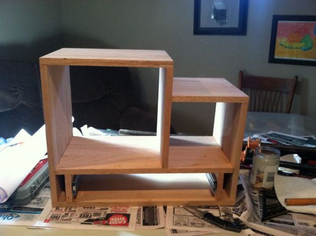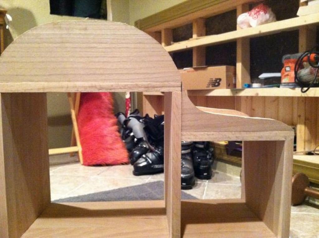 5) Перед тем как начать клеить полку стоит примерить все доски, чтобы все углы были ровные и подходили друг к другу. Затем стоит приклеить бруски и сильно прижать. Дождаться полного высыхания.