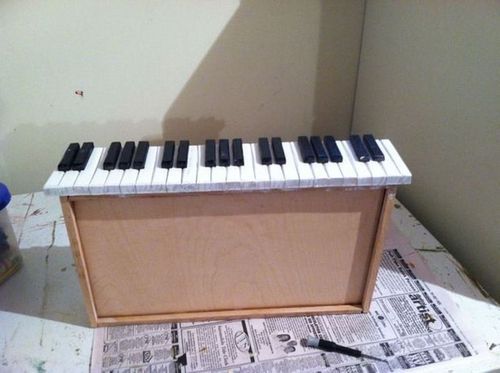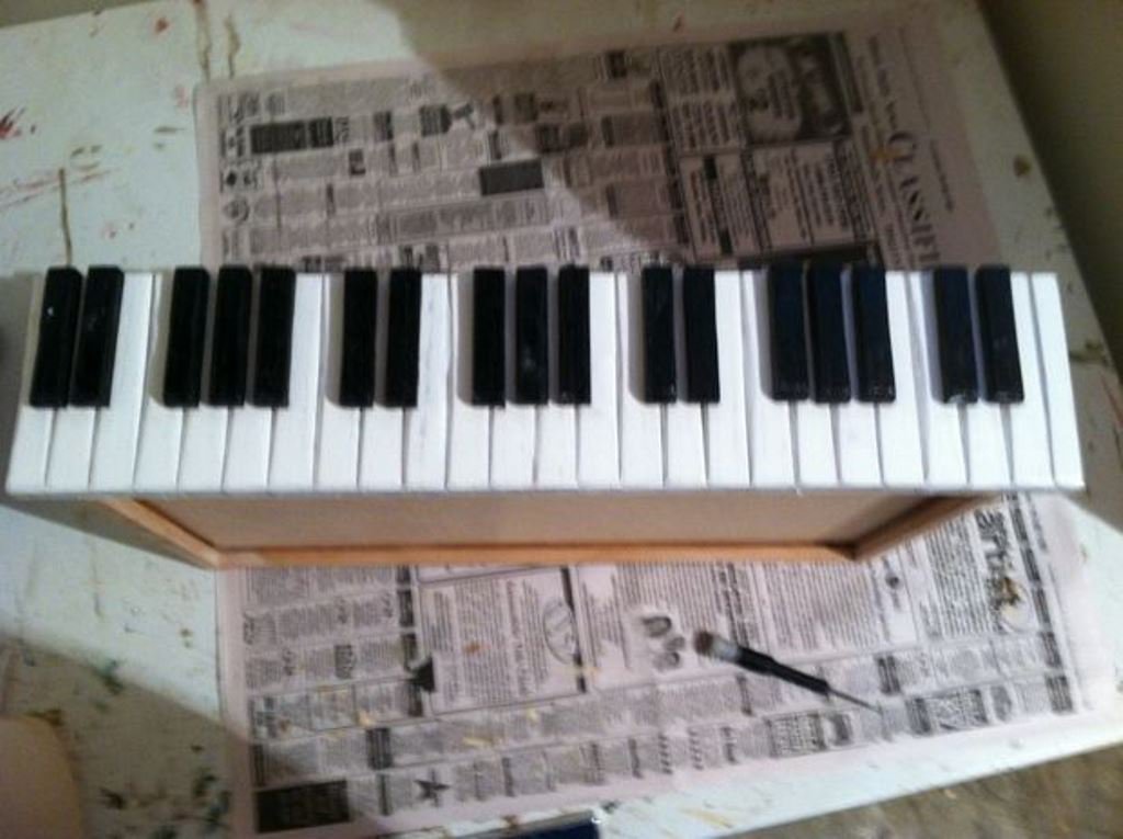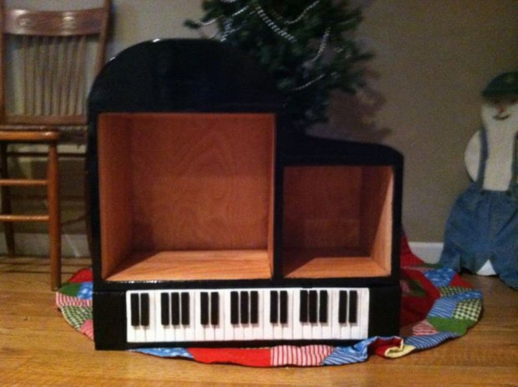 Используйте лобзик и вырежьте фрагменты, с которыми полка будет похожа на рояль. Прикрепить деревянные элементы можно с помощью клея или болтов, отверстия для которых будут расположены на внутренней стороне полки.