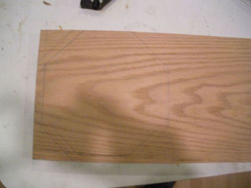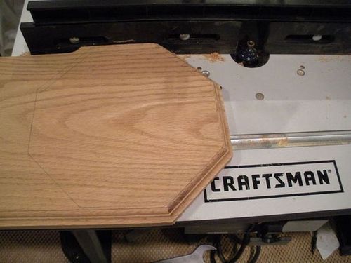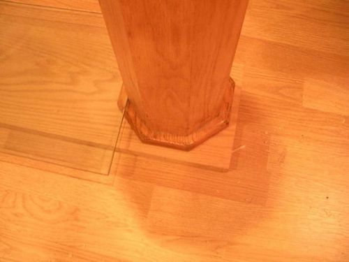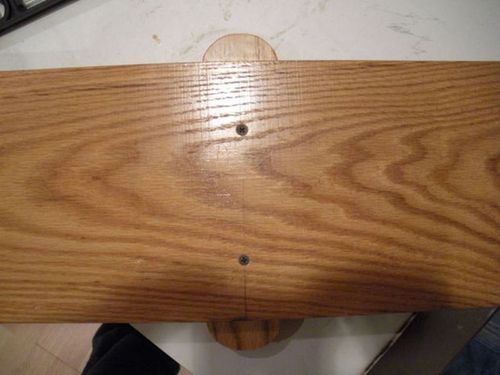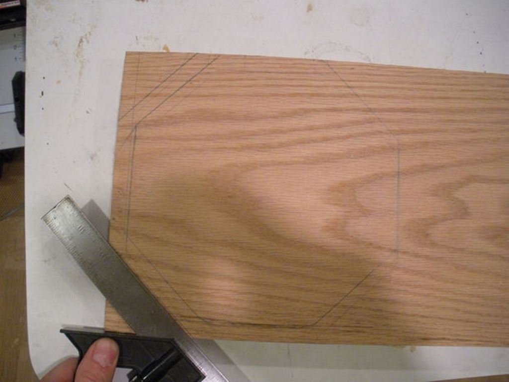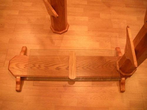 Теперь необходимо изготовить базу для ног. Для нее используется доска красного дуба 22х115х2 см. Ставятся ноги, и кладется между ними стеклянная полка. Отмечается длина основания. Вырезаются углы.