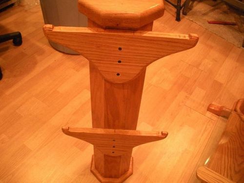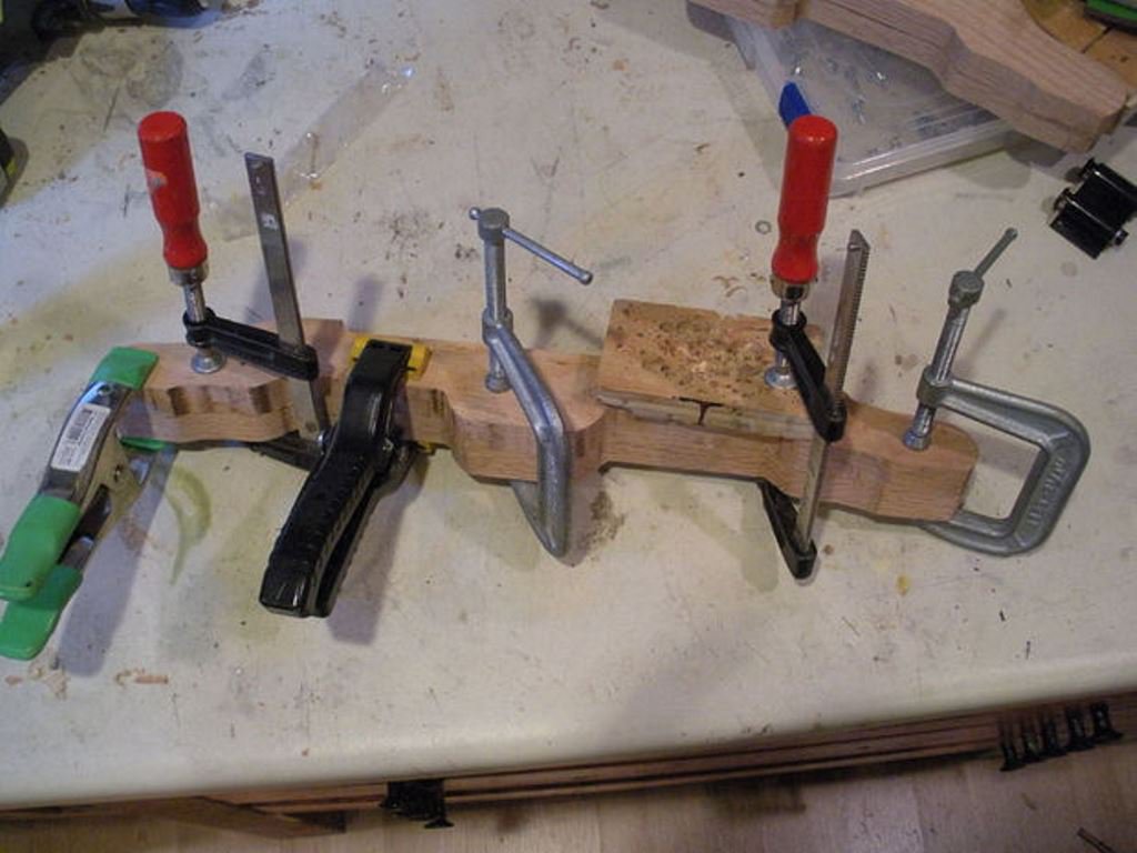 Должно выйти 4 ноги. Затем необходимо склеить 2 вместе, чтобы ноги получились толстыми. Зафиксировать детали до полного высыхания клея. Обработать края на станке.