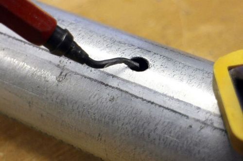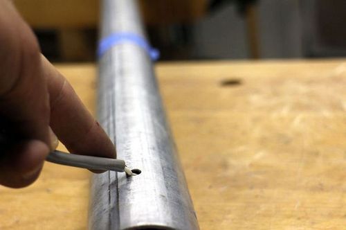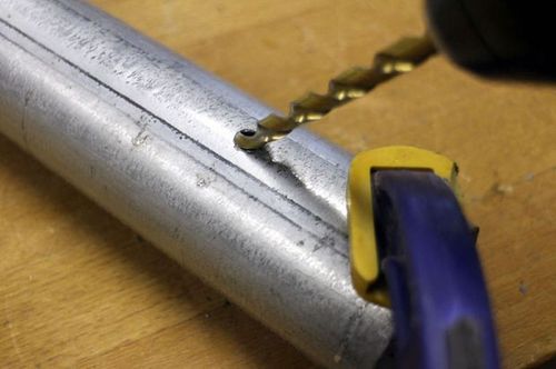 Вблизи одного конца трубы Джон просверлил небольшое отверстие вблизи одного конца трубы для кабеля питания. Отверстие сверлил с наклоном дрели, чтобы задать направление протяжки кабеля. Края отверстия он зачистил от заусенцев и пропустил питающий кабель в трубу, и, протянув его по всей длине стойки торшера, вытянул сверху.
