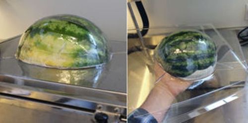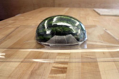 После остывания пластик затвердевает и сохраняет принятую форму. Вы поймете, когда лист пластика можно будет опустить на предмет (в данном случае арбуз) - он начнет провисать под нагревательным элементом. Это видно на фото 4 и 5 в этом шаге.