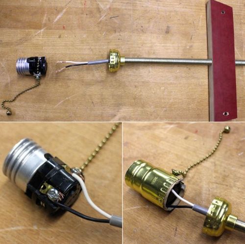 Питающий кабель он пропустил через ниппель и подключил к патрону. Собрал патрон, закрепил его на ниппеле и установил деревянный кронштейн в корпус светильника на винты.
