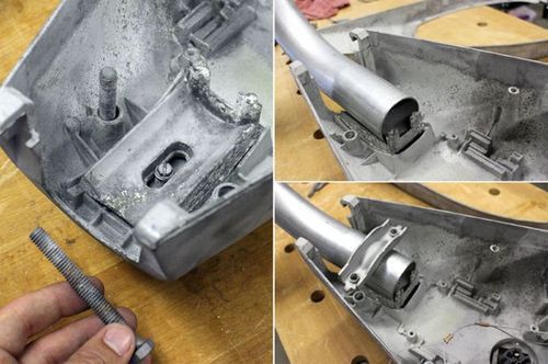 После того как все компоненты были готовы Джон закрепить светильник с коленом на вертикальной стойке. Так как EMT трубы имеют гальваническое покрытие, поэтому использовать сварку было нельзя. Но, к счастью, продаются двухдюймовые EMT обжимные муфты. Муфта обжалась на колене и на вертикальной стойке, скрепив детали вместе. Консоль получилась не очень длинная, и сам светильник получился не очень тяжелым, поэтому муфта будет держать светильник надежно.