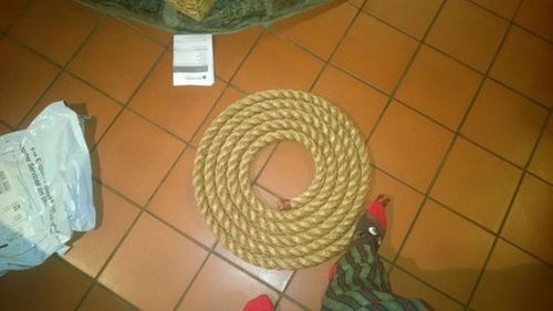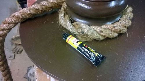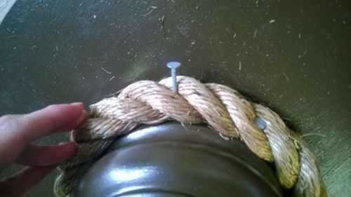 Теперь необходимо накрутить веревку на основание стола. В начале нужно закрепить конец веревки гвоздями, а затем можно просто приклеивать ее с помощью клея.