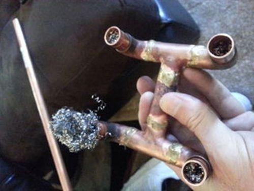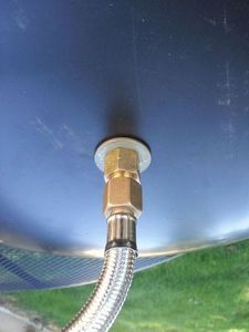 После того, как горелка будет завершена, просверлите отверстие в центре чаши. В это отверстие должна вставляться труба. Поместите большие шайбы с обеих сторон чаши, вставьте горелку в отверстие и вкрутите латунный штуцер ко дну чаши.