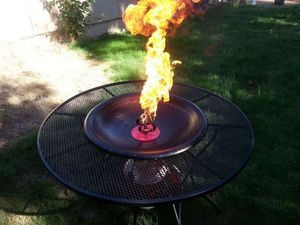 Наденьте чашу на стол и прикрепите шланг от пропана на нижнюю часть горелки/миски. Теперь можно делать испытание огнем, и любоваться проделанной работой.