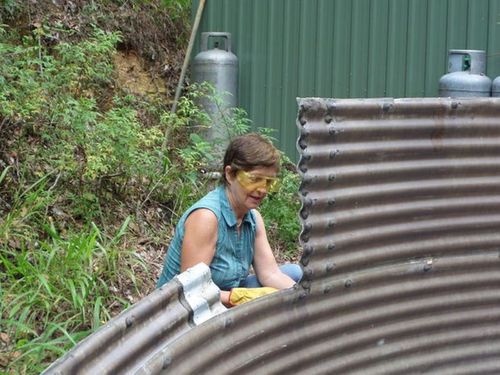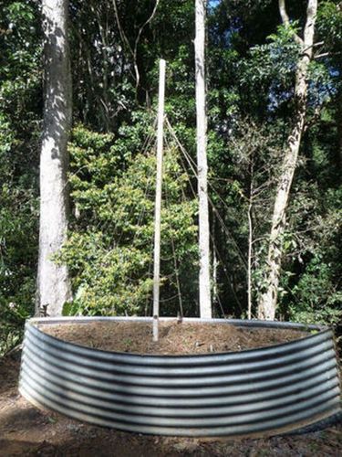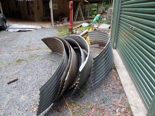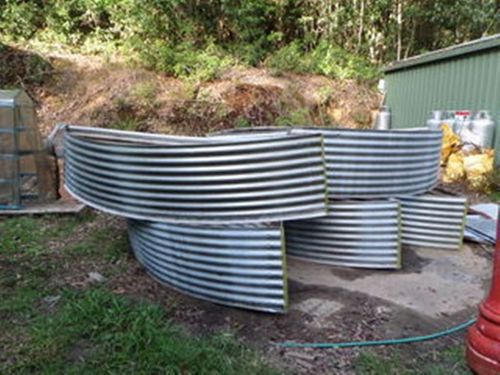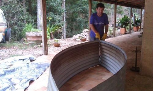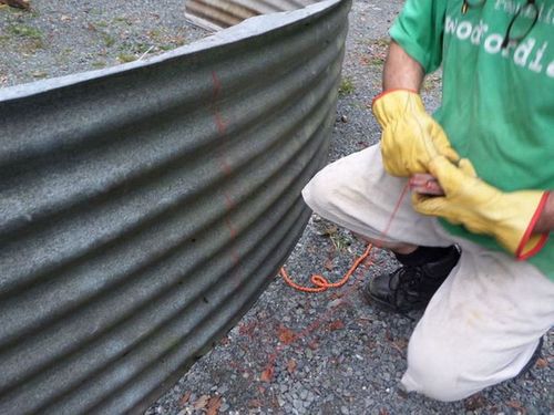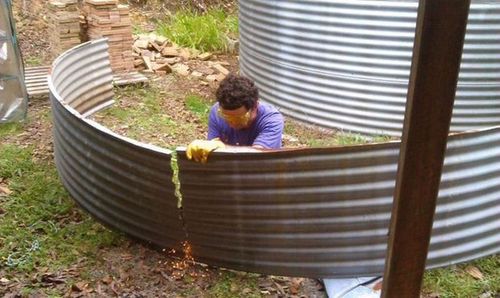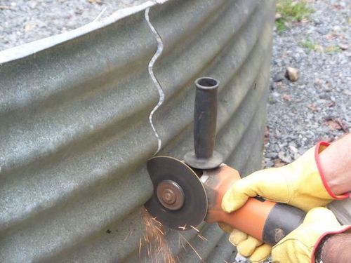 Этот бак был высотой около 1,8 м, в диаметре 3 м, а построен из трех рядов волнистого железа. Крышки были сверху и снизу, их необходимо удалить. Они были приварены к бокам. Используйте ножницы по металлу или любой другой инструмент, чтобы отрезать крышку. Резать следует по верхней кромке крышки, чтобы в конце она упала внутрь цистерны. Так вы сохраните прочные края боковин.