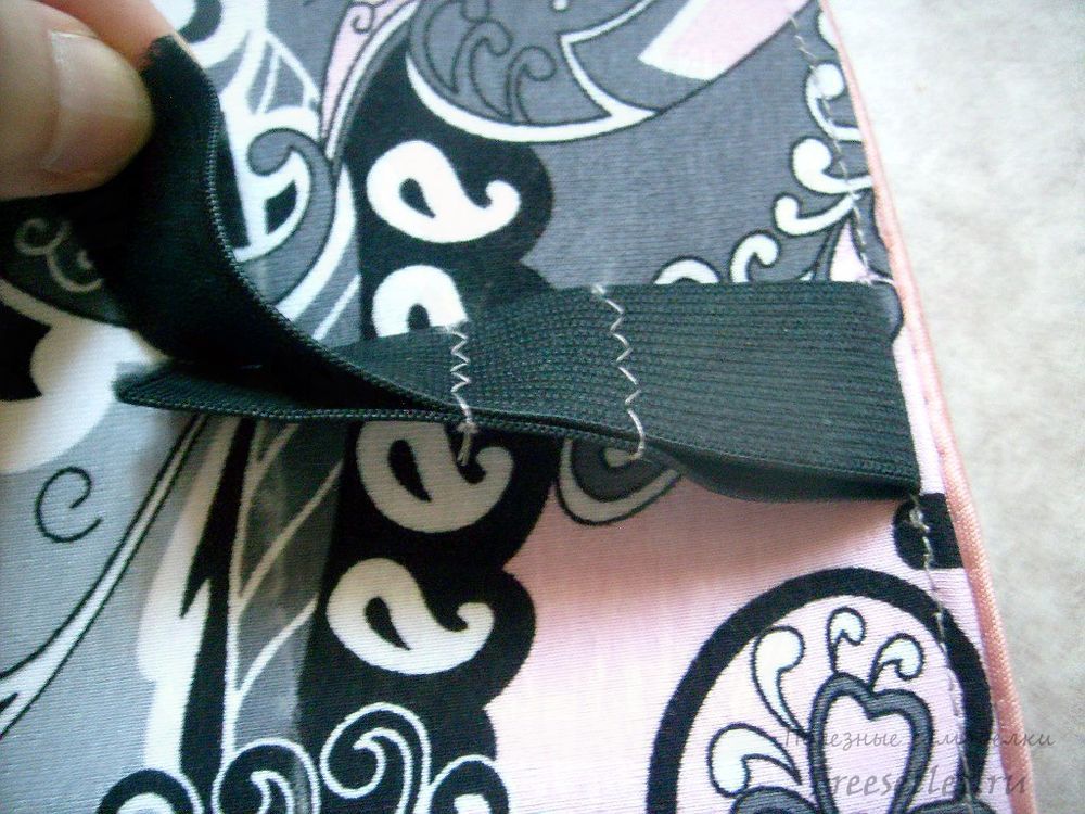 Складываем резиновую ленту вдвое и по разметке прокладываем швы (у нас два), образуя петли-кармашки.