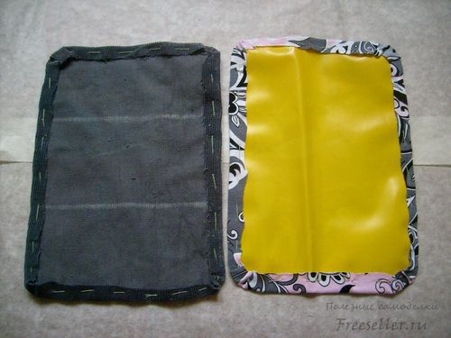 3. Подворачиваем припуски верха на изнанку и примётываем их по всему периметру детали. Припуски подкладки подворачиваем и примётываем, заложив вовнутрь вкладыш.