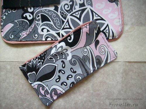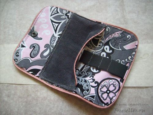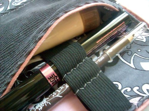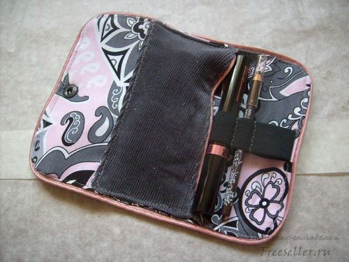 10. Косметичка готова. Закладываем в навесные резиновые кармашки карандаш и тушь, а в карман всё остальное.