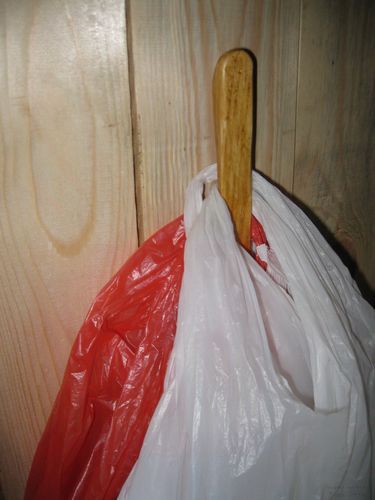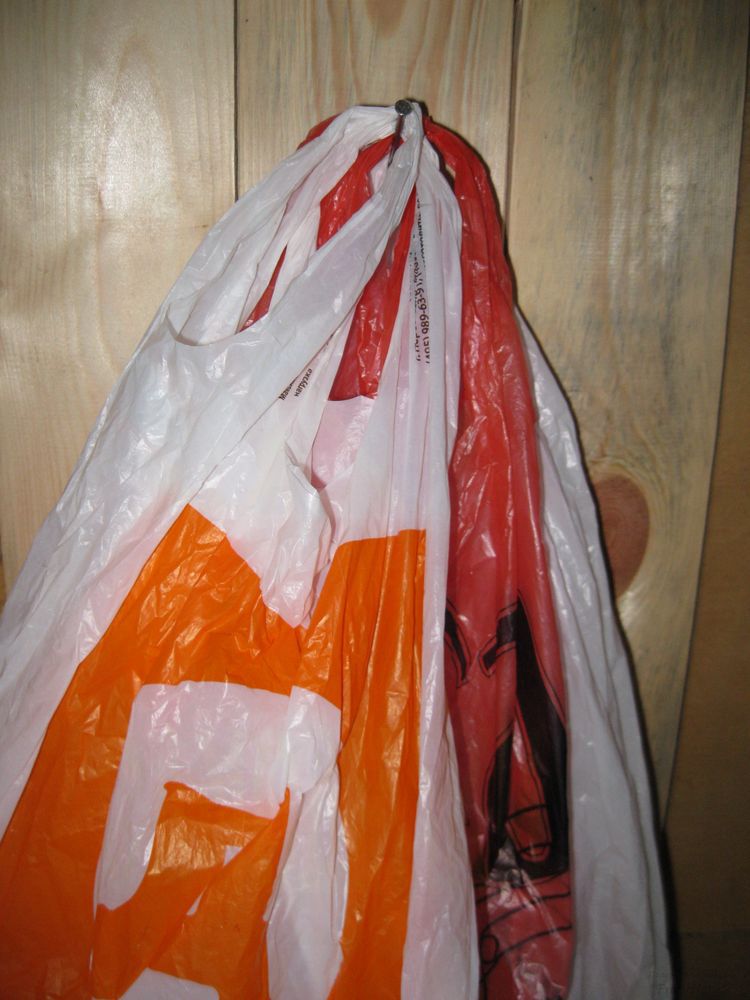И действительно, как видно ниже на фото, даже три пакета повешенные на гвоздь едва на нем помещаются. При этом последний пакет все время так и норовит слететь с гвоздя.