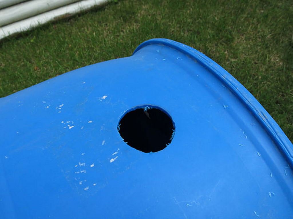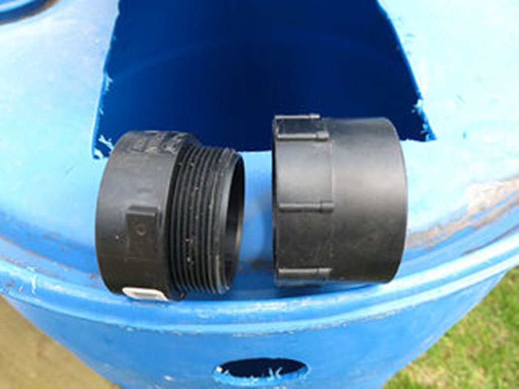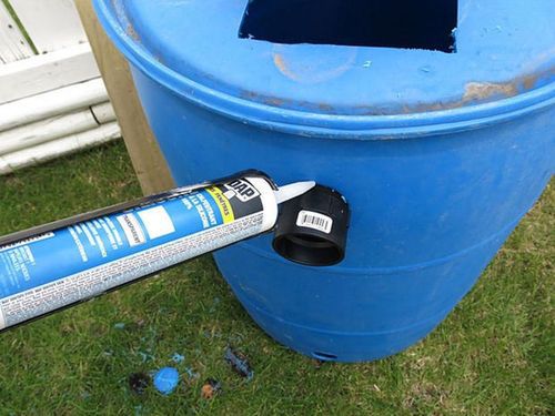 В нижней части бочки нужно вырезать первое отверстие, диаметр которого зависит от используемого фитинга. Выше над ним вырежьте еще одно такое же отверстие. Фитинги закрепляют на бочке с помощью клея и обрабатывают крепление силиконовым герметиком.