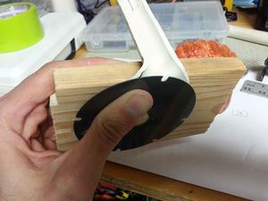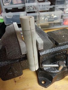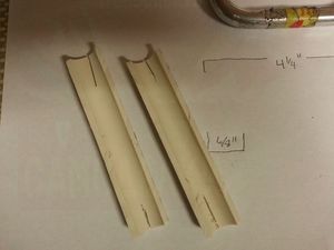 Сделайте разметки и вырежьте ПВХ трубку, как показано на рисунке. Разрежьте трубку ПВХ вдоль пополам, с двумя длинными разрезами по разным сторонам. Сделайте прорези в каждом из четырех концов.
