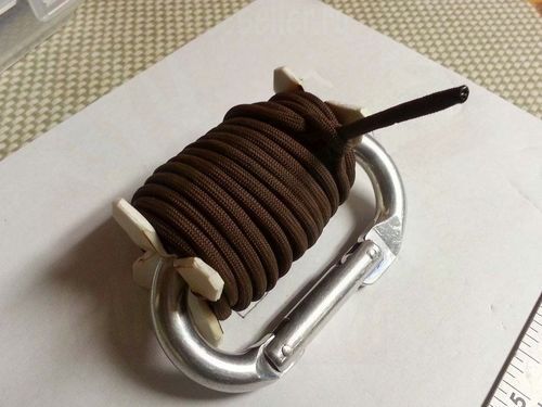 Теперь накрутите на шпульку шнур и закрепите его узлом. Теперь можно брать карабин с веревкой куда угодно.