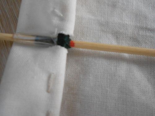 Конец нитки приклеиваем скотчем.То же самое мы делаем со второй шпажкой (2 метка).