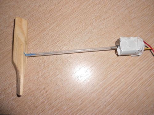 2. Из ручки мы берем стержень длинной 110 мм. Пропеллер я делал из небольшого бруска со сторонами 80 мм на 10 мм. Я по тихонько отрезал ножом с каждой стороны (придавая форму пропеллера). Подробнее об изготовление пропеллера вы можете узнать на разных других сайтах. Отрезаем кусочек проволоки. Один конец вставляем в стержень, а другой в пропеллер, но так чтобы проволока не шаталась. Второй конец стержня мы вставляем в вал двигателя. Двухсторонним скотчем мы приклеиваем к треугольнику основания (можно закрепить двигатель обычным скотчем - для прочности).