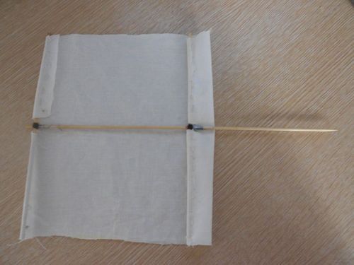 2. Берем ткань со сторонами 210 мм на 200 мм. Отмерив 100 мм, делаем надрез 5 мм. И с другой стороны делаем также. Прикладываем ткань к 3 шпажкам и заворачиваем в другую сторону на 10 мм с 2-х сторон. Аккуратно пришиваем!