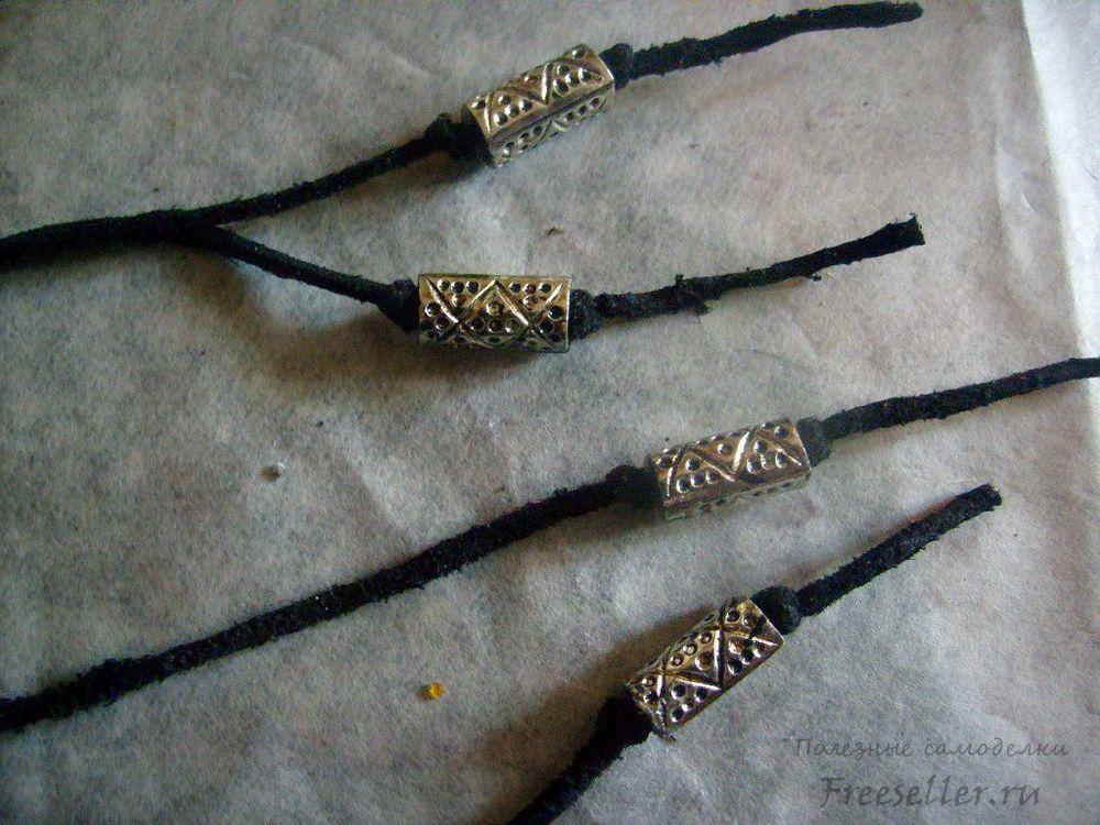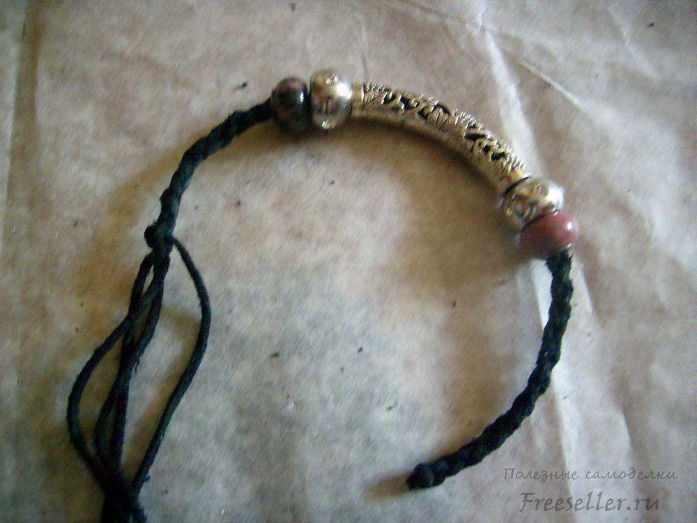 6. Надеваем на концы мелкие бусины, фиксируя их с обеих сторон узлами.