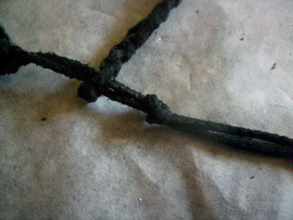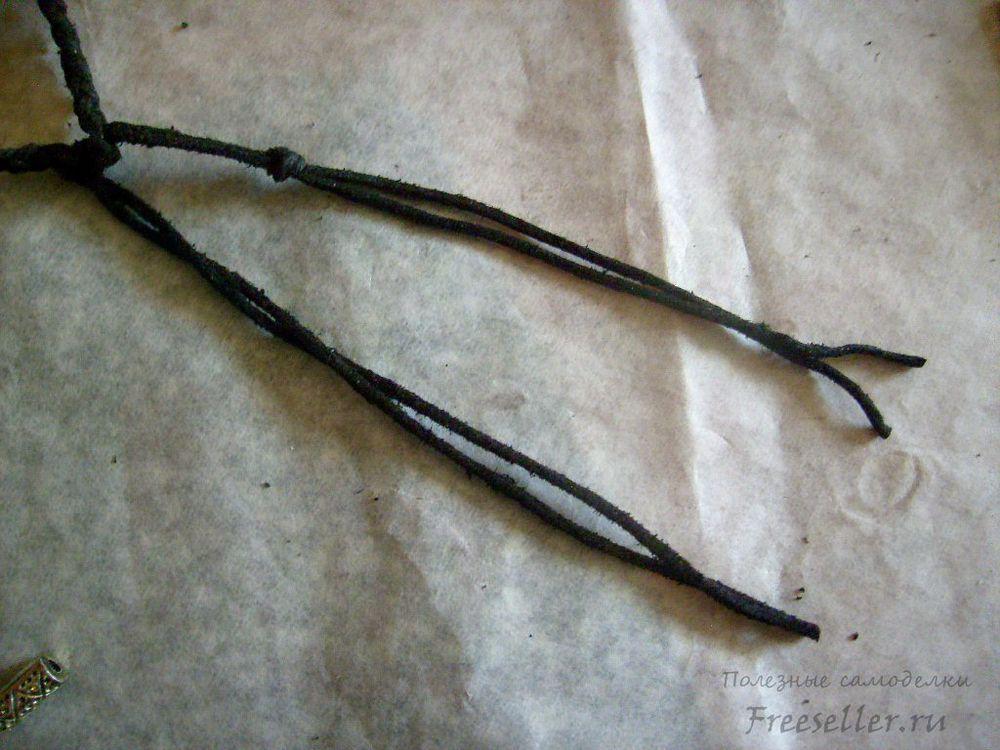 5. Протягиваем шнуры застёжки до конца. Складываем все четыре тонких шнура вместе и обрезаем, придавая им равную длину.