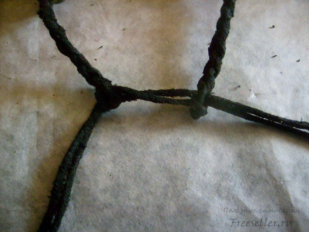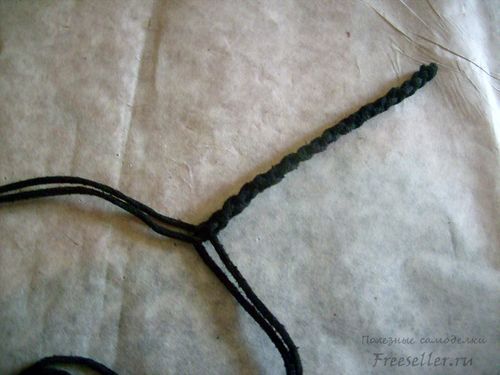 4. Фиксируем конец плетения двумя узлами - попарно связываем между собой тонкие шнуры. Протягиваем одну пару концов сквозь первый ряд плетения.