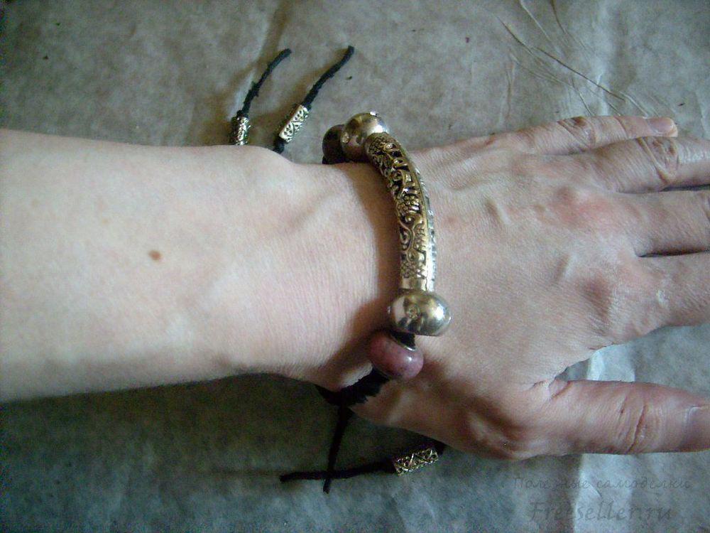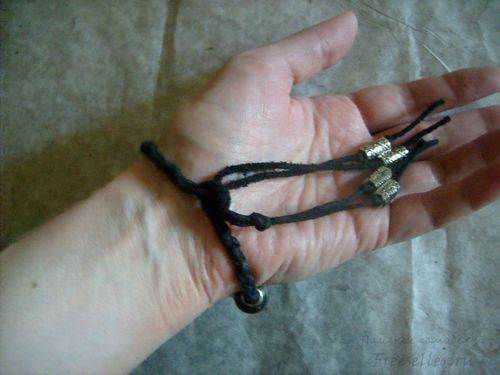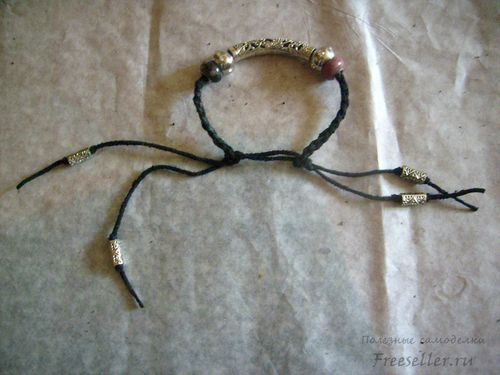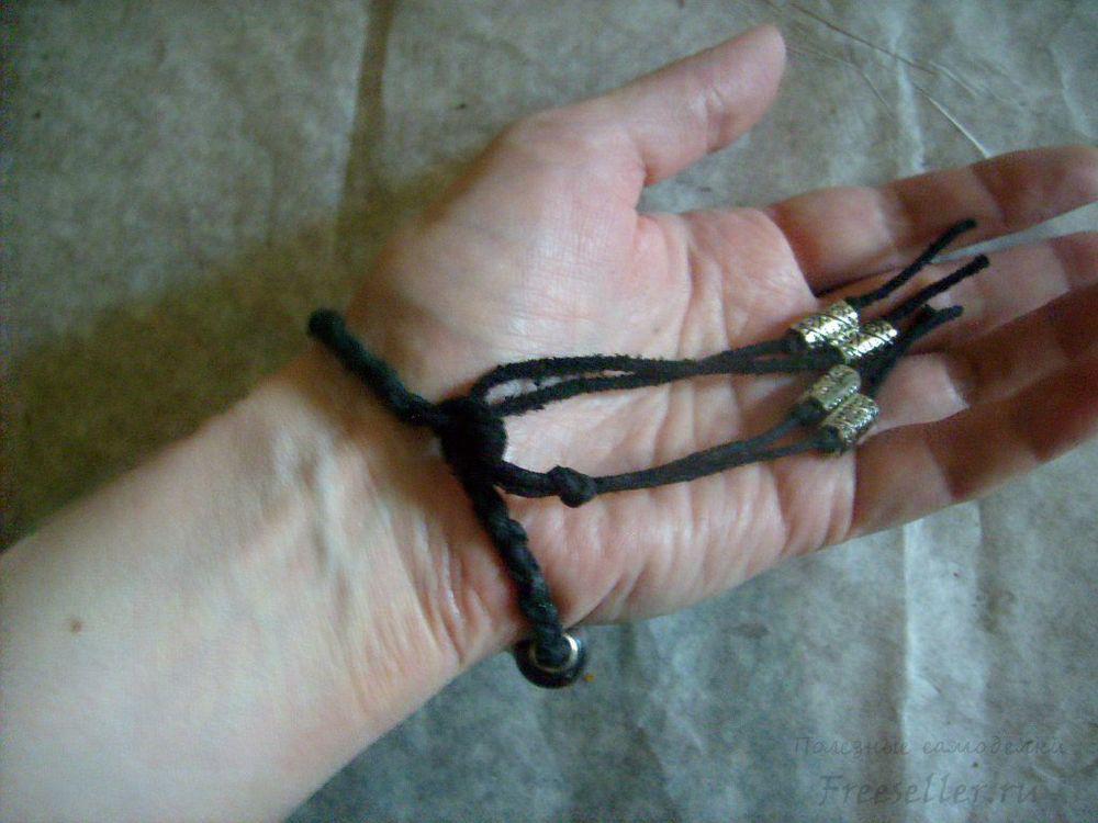 Оставляем запас длины, достаточной, чтобы надеть и снять браслет, но не позволяющей ему соскользнуть с руки. Фиксируем застёжку узлом.