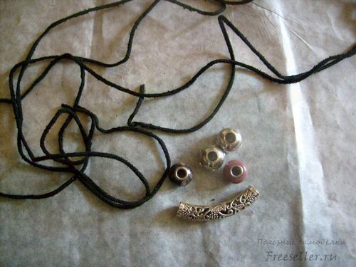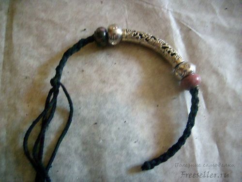 2. Примерно на середине плетения нанизываем на шнур крупные бусины в нужном порядке. Готовый шнур в изогнутую трубочку не пройдёт, поэтому протягиваем сквозь неё тонкие шнуры по одному с помощью крючка и щипцов.