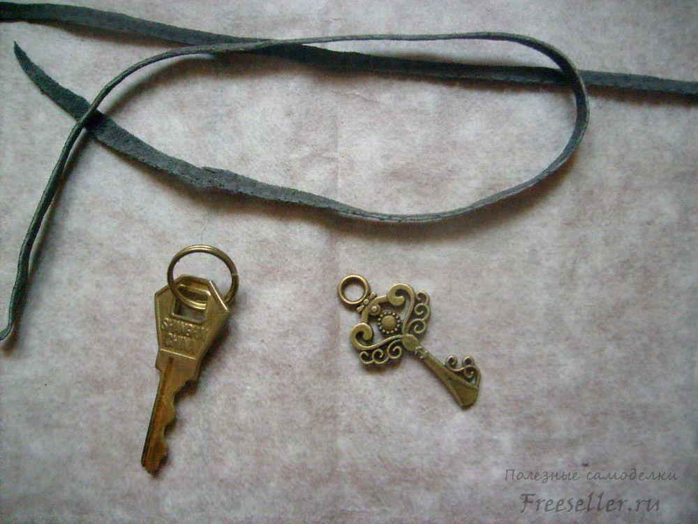 Основной элемент нашей подвески - изящный витой ключик из жёлтого металла. Кроме него мы использовали кольцо небольшого диаметра от обычных мебельных ключей и обрезки замши. В работе задействовали ножницы и клей.